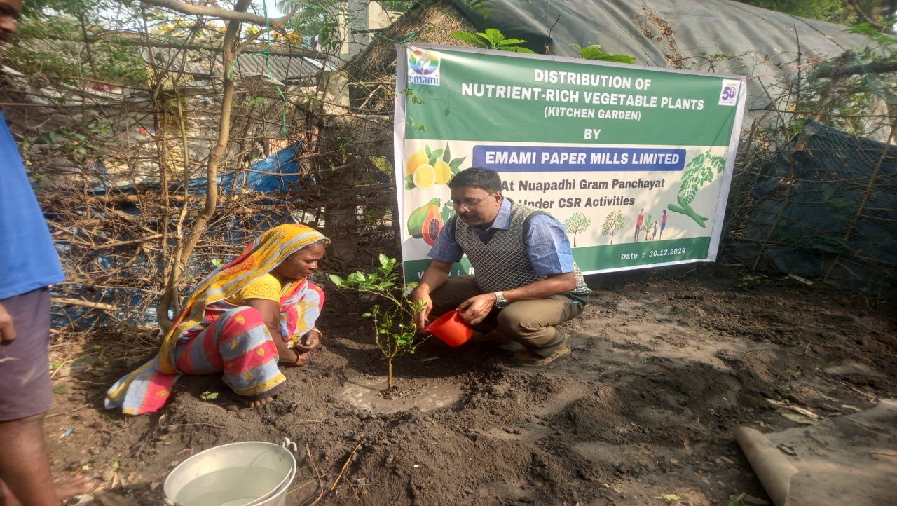 Emami Paper Mills Limited is committed to promoting environmental sustainability and ecological awareness in its surrounding communities. The company conducts extensive community plantation drives, increasing its annual sapling distribution from 5,000 per year to 1 lakh per year, actively engaging villagers in greening initiatives.